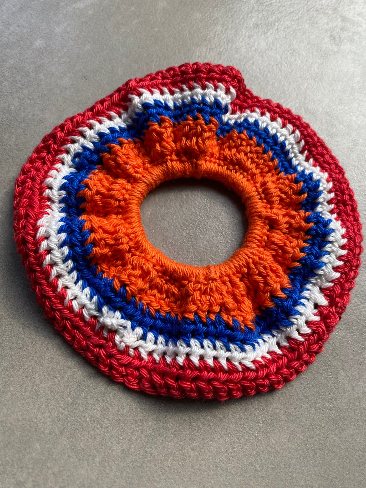 Deze scrunchie in de kleuren oranje, rood, wit en blauw maken het helemaal af!